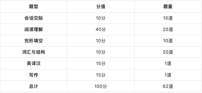 河北地區(qū)學位英語2022年下半年考試新增了完形填空題型,目前試卷共6個題型包括會話交際、閱讀理解、完形填空、詞匯和語法、英譯漢和短文寫作。